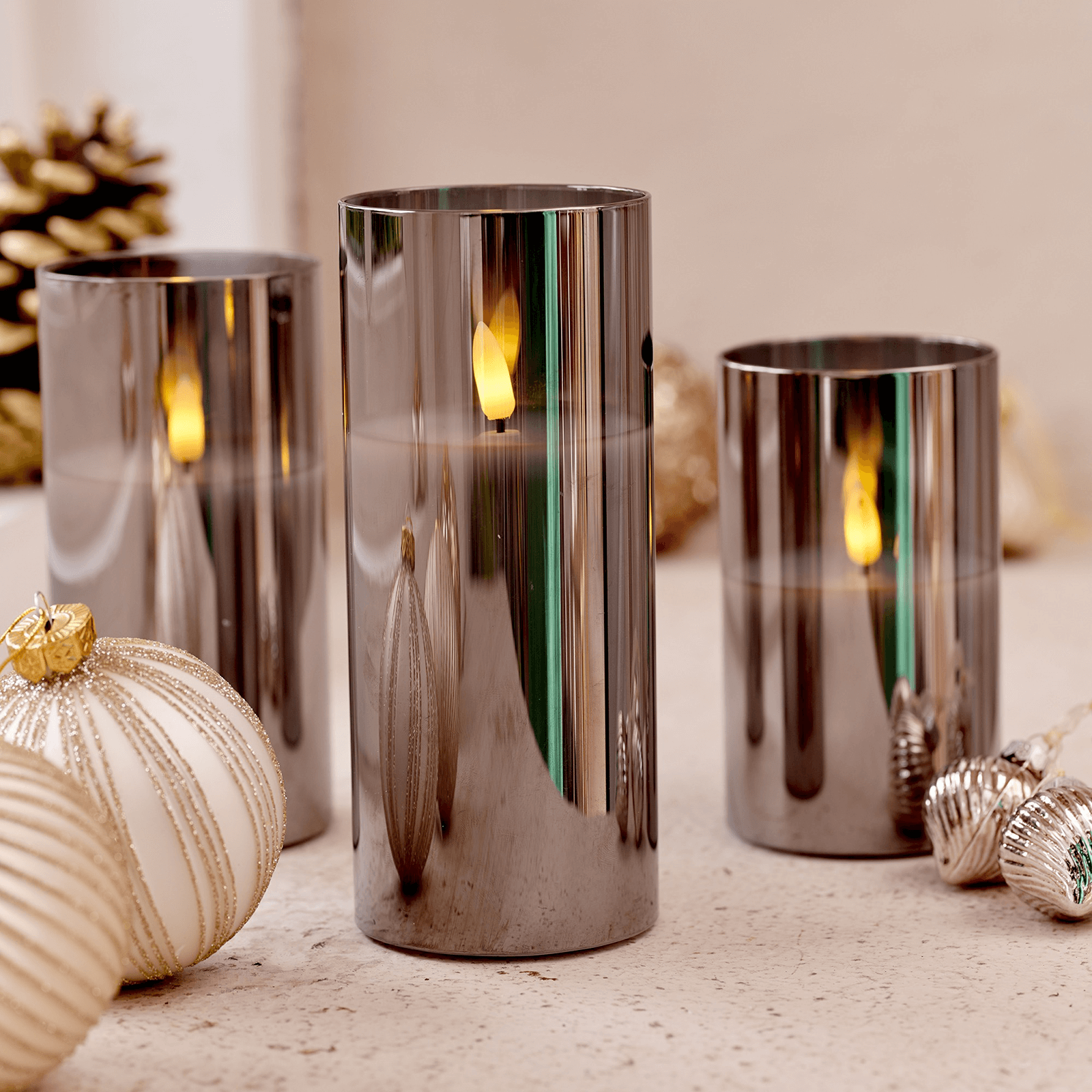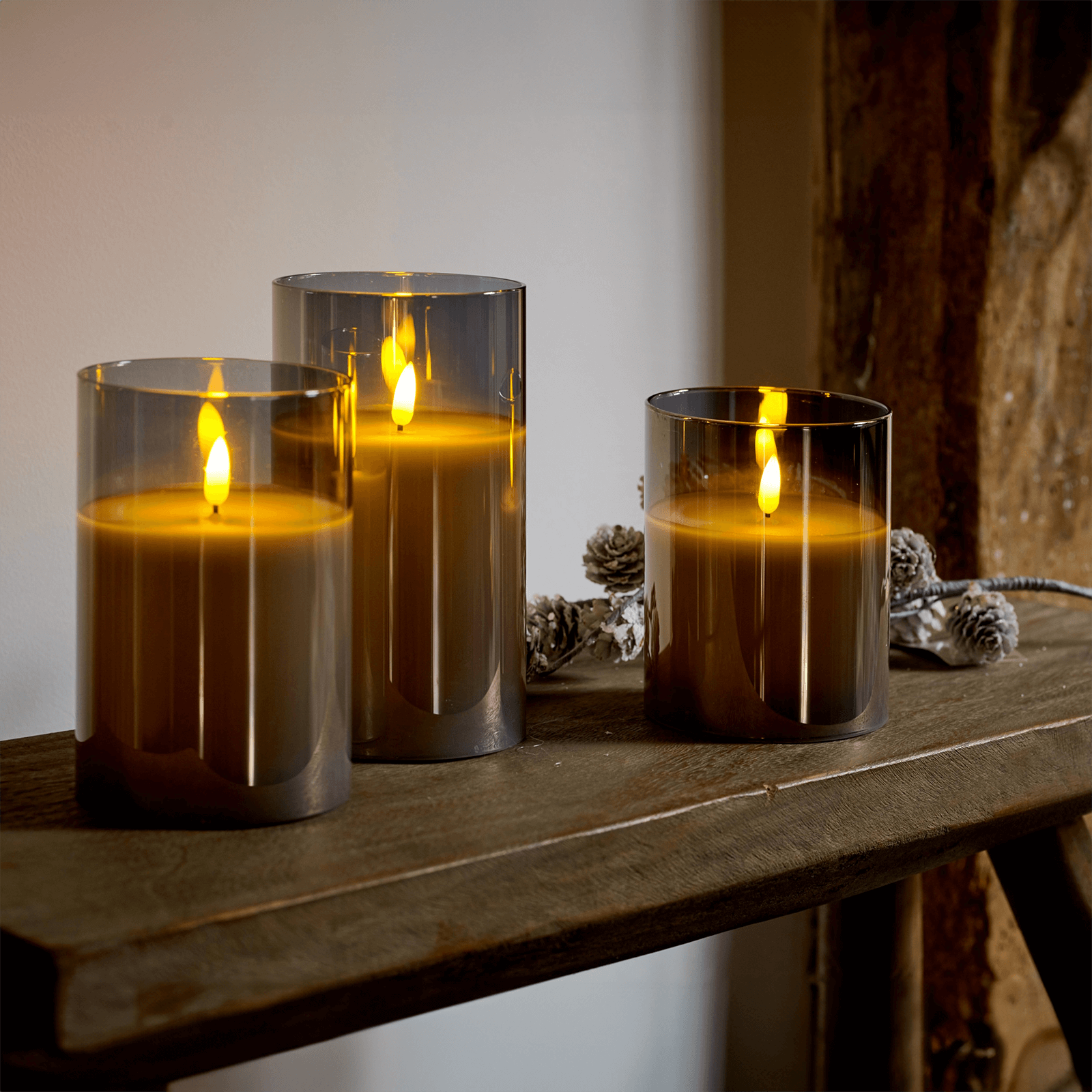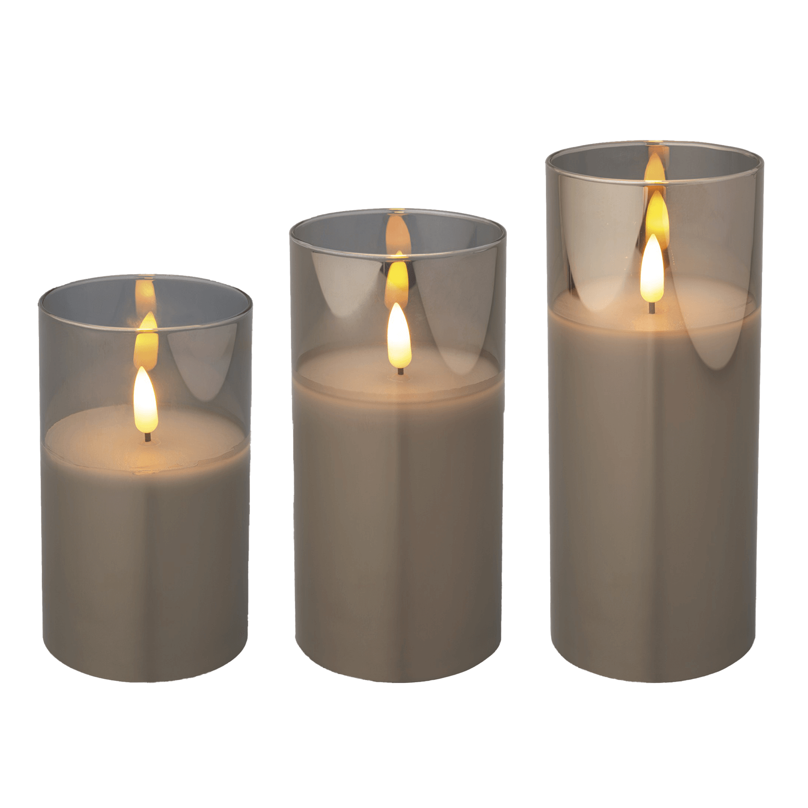 The Flameless Pillar Candles have a diameter of 10 cm and a height of 12.50 cm, 15 cm and 17.50 cm respectively, and come in an attractive grey jar. The set is extremely versatile and can be used for shop windows, shops, birthdays, Christmas, garden parties, bars, hotels, holidays, weddings or other occasions. This set is a great addition to any room or venue to create a cosy atmosphere.