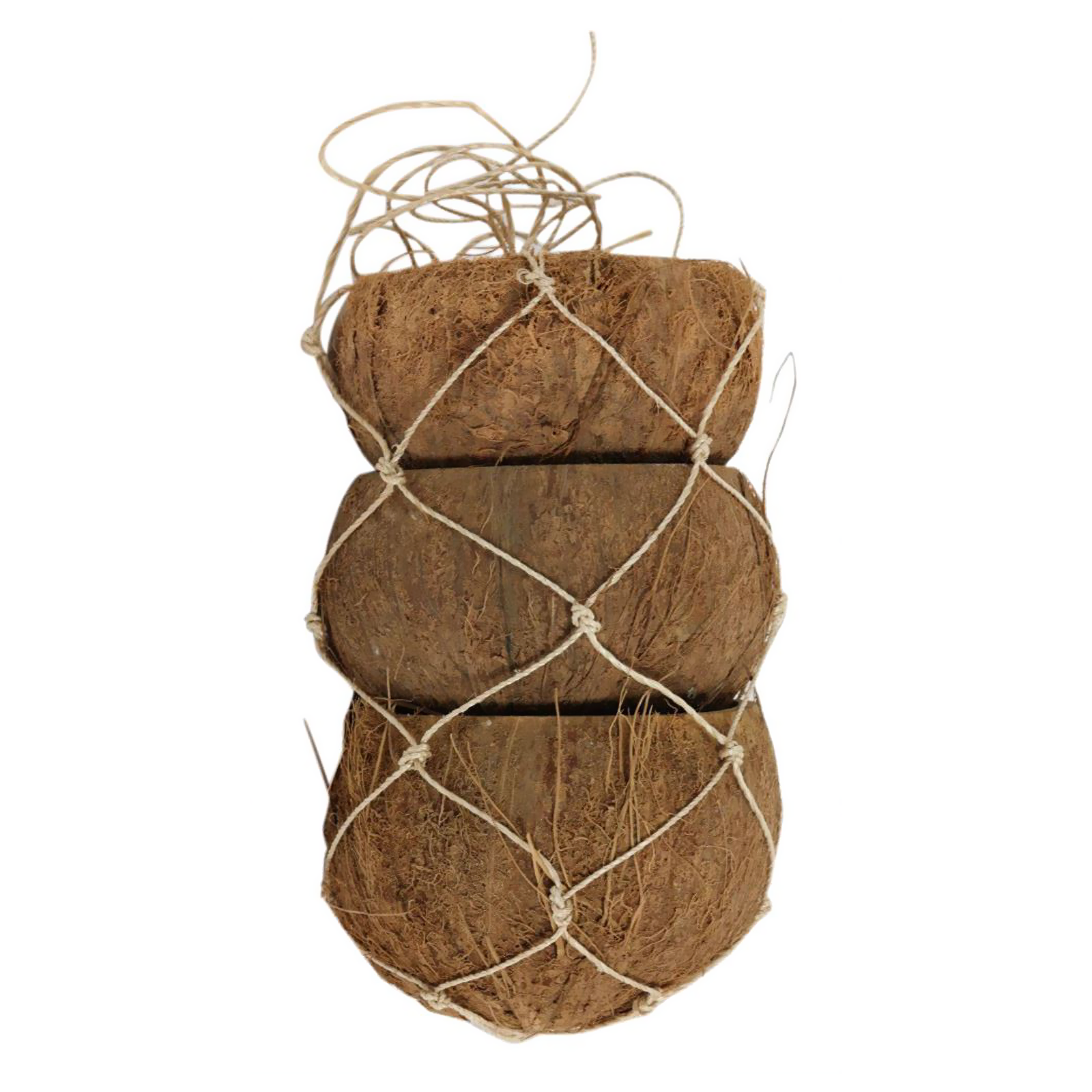 3 mitades de coco natural en una red