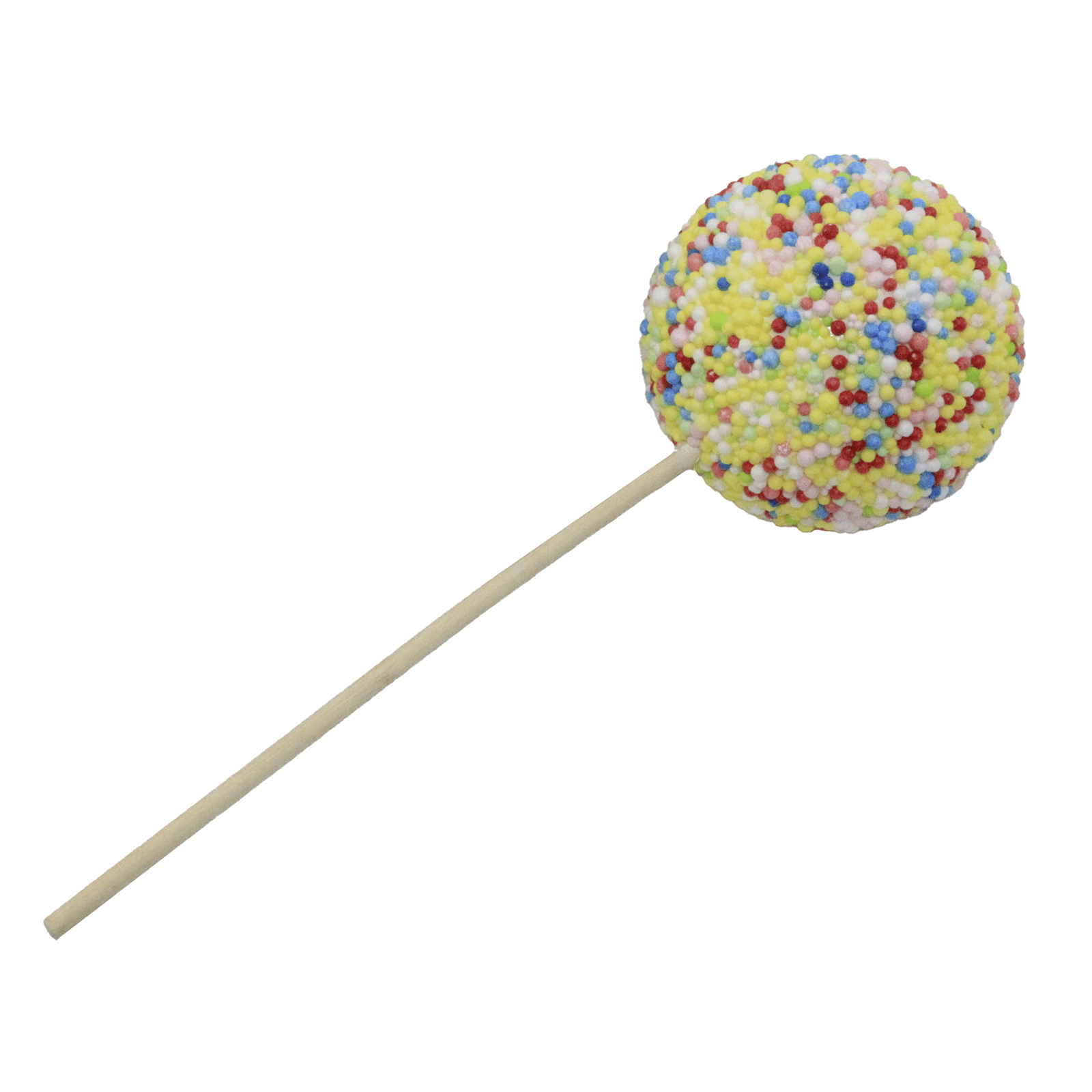 El Cake Pop XXL de espuma dura, disponible con un diámetro de 14 cm o 17 cm, atrae todas las miradas en cualquier presentación decorativa. Con su glaseado blanco y sus coloridas virutas, este caramelo de gran tamaño aporta ligereza y frescura a cualquier presentación.