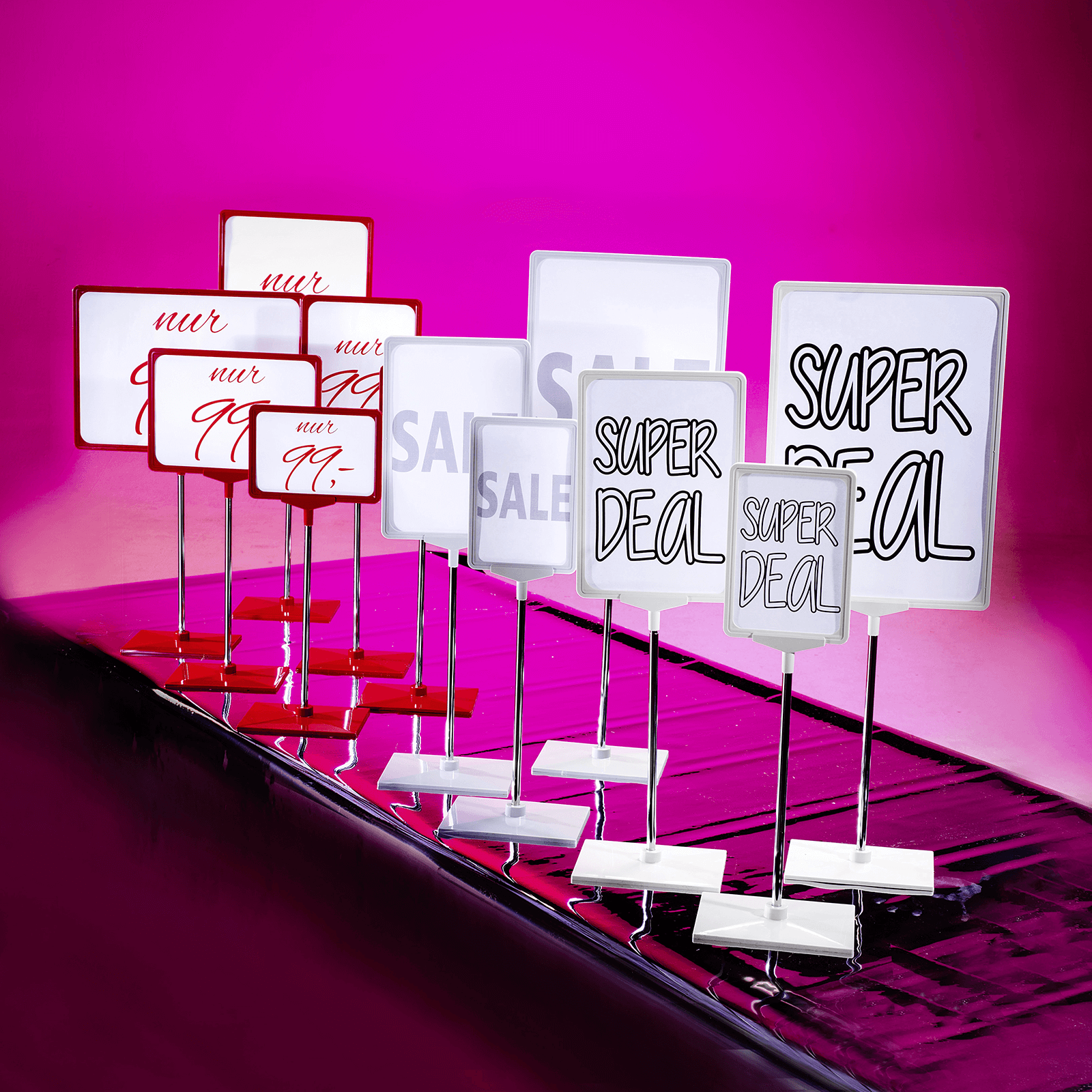 El clásico soporte POS para la mesa y el mostrador. En farmacias, restaurantes, oficinas, supermercados y edificios públicos, las ofertas y la información se colocan de forma efectiva y llamativa. El fácil manejo y el bajo peso de esta pantalla permite un rápido uso y una fácil reubicación. El signo consiste en un tubo de soporte de aluminio extensible, una placa de soporte, un marco para el póster y una pieza en T de plástico estable, con abertura de inserción. Formato vertical o apaisado.