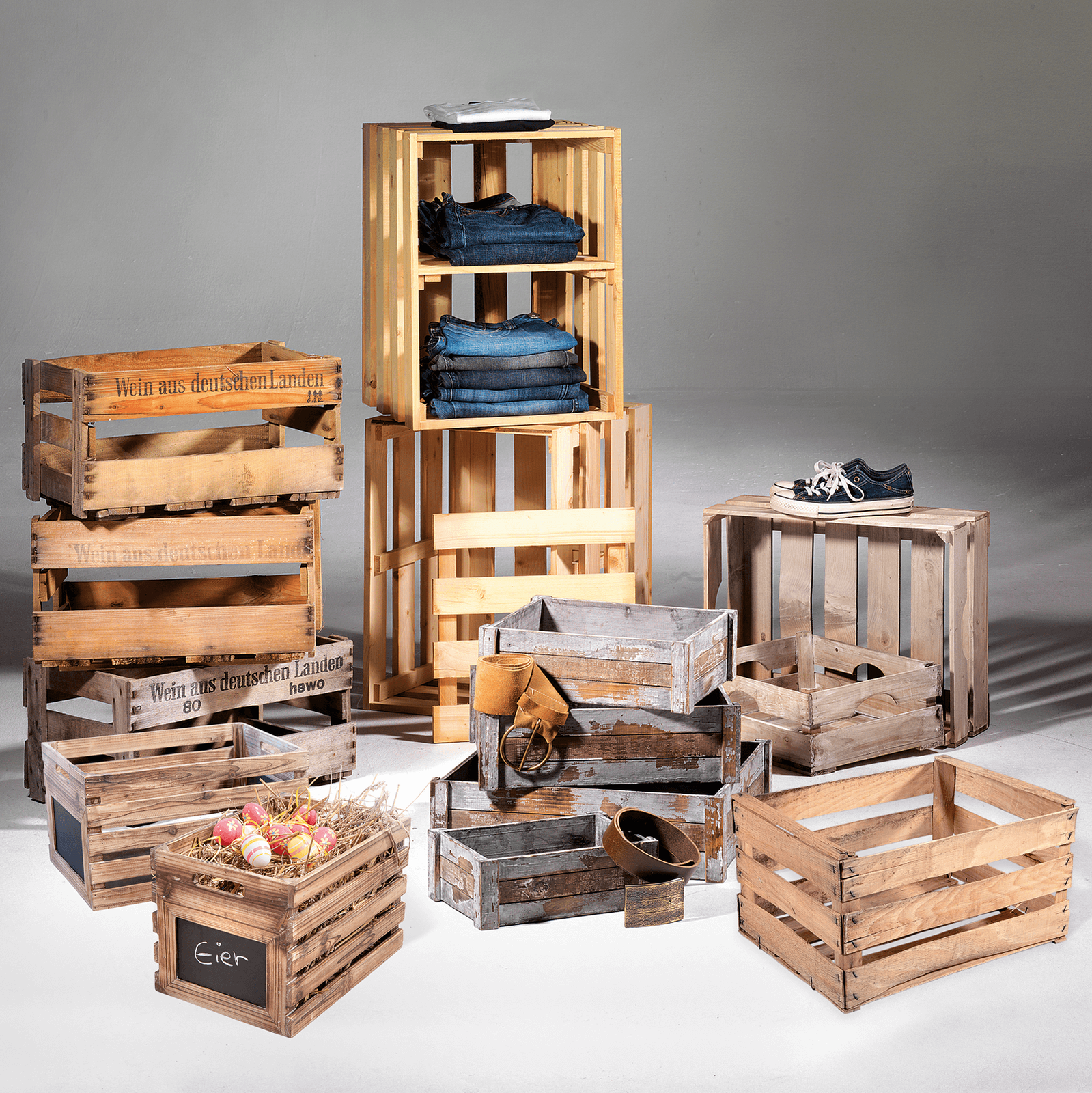Les caisses déco en bois avec une belle patine et des traces d’usure apportent une touche individuelle et créative à vos espaces. La caisse universelle robuste de style usé à la mode peut être utilisée comme boîte de rangement, caisse de fruits, caisse de vin, étagère, table d’appoint ou siège. En offrant une seconde vie à cette caisse en bois, vous apportez également une contribution importante au recyclage. Grâce à leur veinure naturelle et les couleurs du bois individuelles, chaque caisse en bois est unique. Les traces d'utilisation et d’altération sont voulues et ne constituent pas des défauts. Prix/pce.