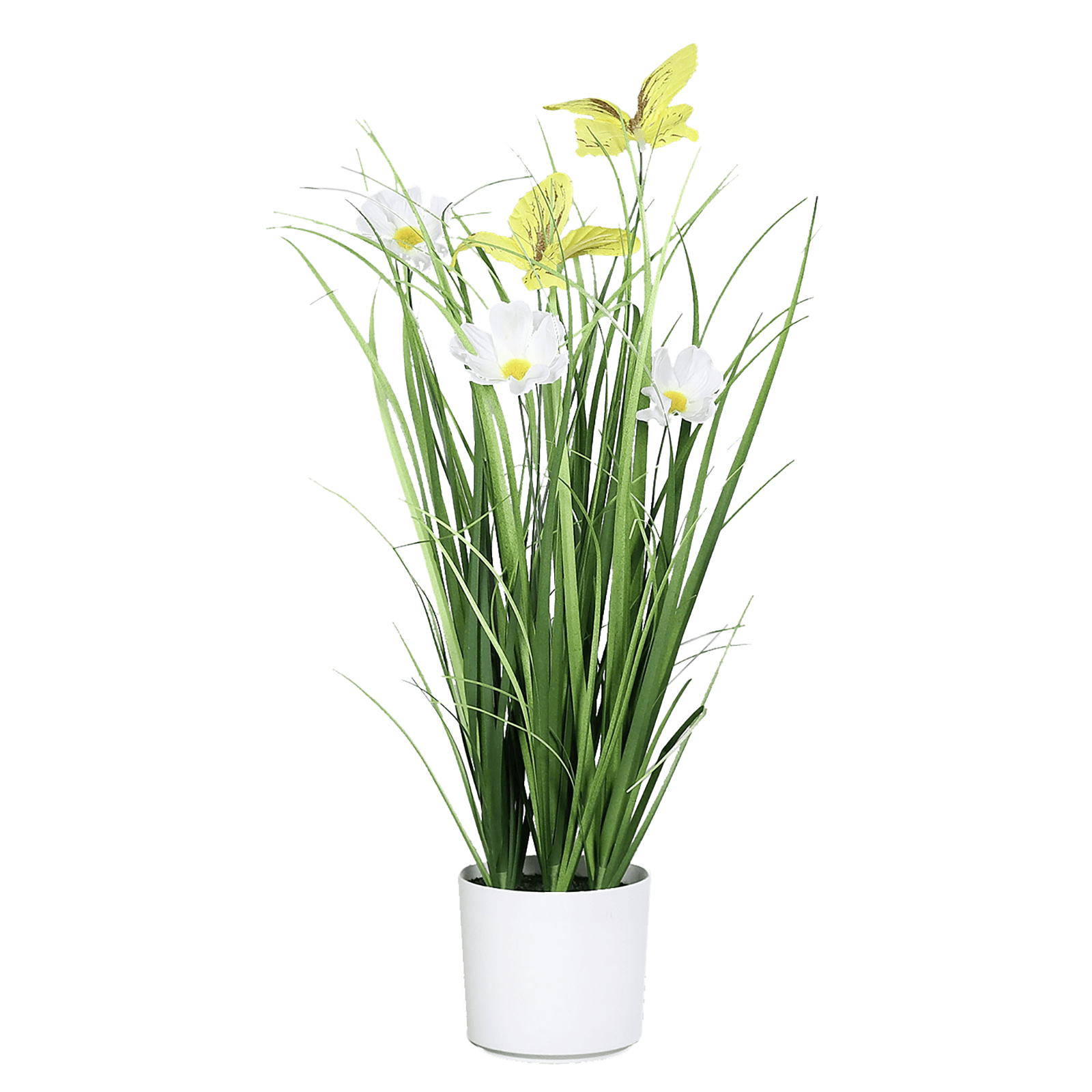 Herbe artificielle avec fleurs et papillon dans un pot blanc - 39 cm