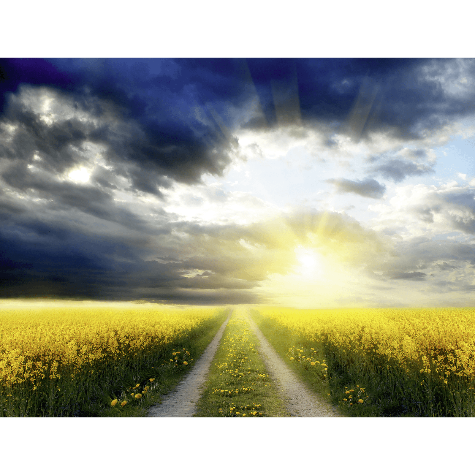 Leuchtend gelbe Rapsfelder erfreuen das Auge per se schon von Natur aus. Wir von DecoWoerner setzen dem Ganzen noch eins drauf. Auf unserem XXL-Banner wird das leuchtende Gelb der Pflanzen durch ein beeindruckendes Sonne-Schattenspiel nochmals aufs Schönste wiedergespiegelt. Mittig durchs Motiv führt ein Feldweg, zu dessen Seiten die gelben Rapsfelder blühen. Der Blick wandert automatisch in die Ferne, entlang des Weges, einem spektakulären Sonnenuntergang entgegen. Kraftvoll leuchten die Sonnenstrahlen direkt den Betrachter an und stemmen sich gegen dunkelblaue, aufziehende Wolken, die aufgrund der Komplementärwirkung das leuchtende Sonnengelb noch mehr betonen. Ein Wow-Anblick im Großformat.
